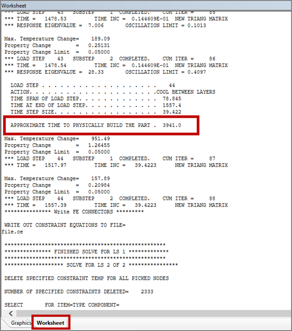 View the solver output to get an estimate of the real machine build time. It is approximately the transient thermal build step simulation time multiplied by R^(1/3), where R is the number of deposit layers in one element layer. This data is available after the thermal solution. Click the Solution Information object and then click the Worksheet tab under the Geometry window. In the Details view, be sure that Solver Output is selected as Solution Output.