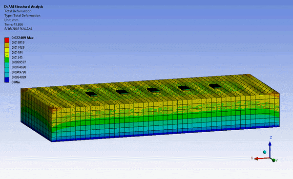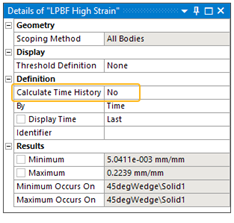 Note: To ensure a quick, dynamic calculation of results, Calculate Time History is set to No by default for this result item. Set Calculate Time History to Yes and then right-click Evaluate All Results to see the time history results, such as the layer-by-layer animated build. For large models, the calculation may take some time.