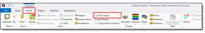 It is important (and fun!) to change the magnification scale of the display in the Geometry window so you can get a true sense (or an exaggerated sense) of the deformation in your build. With Total Deformation highlighted in the project tree, from the Result context tab, select the True Scale option from the drop-down menu. Animate the results using the animation controls. Select other scales from the drop-down menu to see exaggerated results.