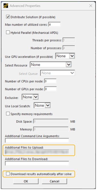 For linked AM Analyses like Thermal-Structural simulations, once the thermal result files are fetched from the server, you must manually upload the .rth files for the structural solve using the Advanced Properties in the Solve Process Settings. The Additional Files to Upload field must have the complete path of the thermal result files (.rth) separated by a comma for all linked upstream thermal analyses (AM Thermal, Heat Treat Thermal, etc.).