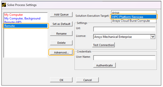 You can leverage Ansys HPC Platform Services (HPS) to accelerate Additive Manufacturing simulations. Inherent Strain and Thermal-Structural simulations with heat treatment steps can be solved on HPC Platform Services. This feature requires that you set up a Solve Process Queue for the required HPC server details.