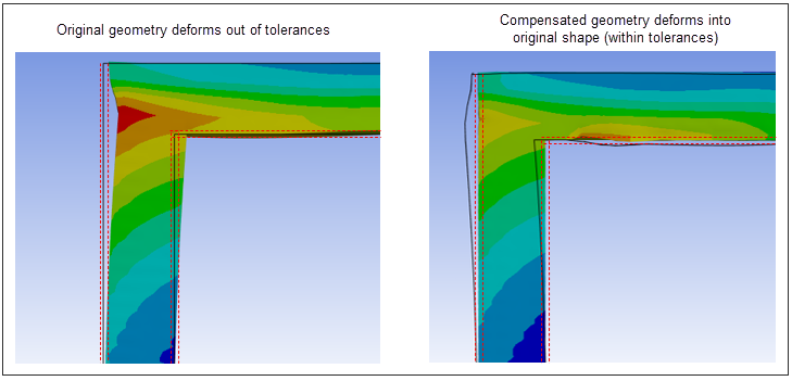 Right Image: Displays the same geometry after undergoing automatic, iterative distortion compensation. The gray outline now represents the final, compensated geometry needed as the starting point to ensure the processed geometry remains within tolerances.