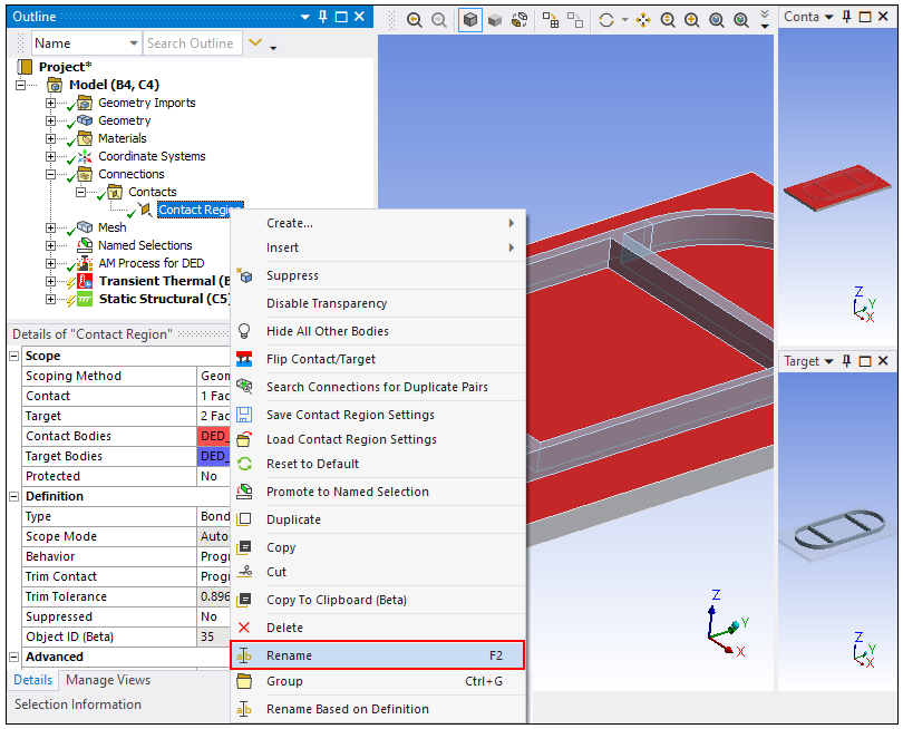 Expand the Contacts object and right-click Contact Region. Choose Rename and enter DED_Contact as the new name. This is required for solution of the DED simulation.
