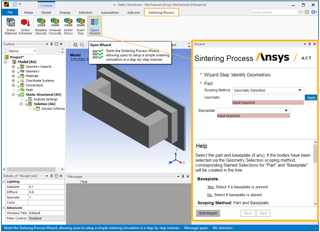 To start the wizard, select the Sintering Process tab and then select the Open Wizard button.