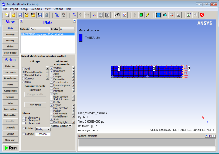 Start Autodyn on your computer and from the main menu load cycle zero of the problem user_strength_example_0.ad (found in the folder \ANSYS Inc\v261\aisol\Samples\AUTODYN).