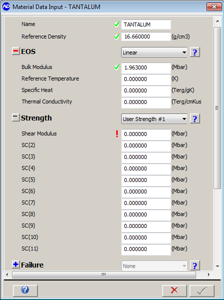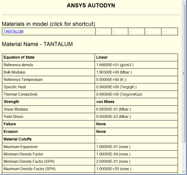 Now select the menu, and Review the material data for TANTALUM. You will notice that a Von Mises yield model has been specified for this material. This model allows you to define a constant yield stress.