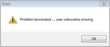 Save the model and press . The error dialog displayed below will be shown because no user subroutine has been written and compiled for User Strength #1. This will be done in the following steps.