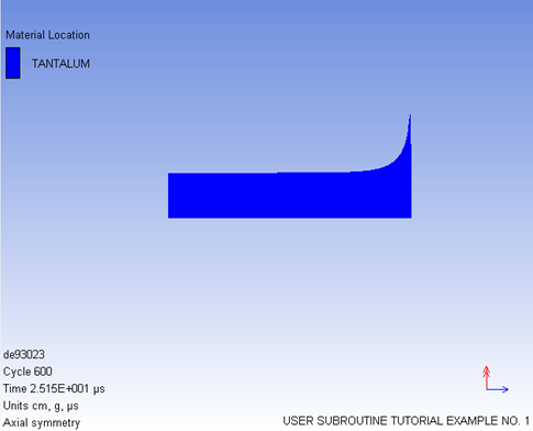 Use the options on the Plots menu to see the material locations and boundary conditions for the problem. You will see that the problem consists of a tantalum cylinder impacting a rigid wall: