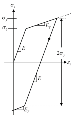 Beyond the user-specified initial yield stress , plastic strain develops and stress-vs.-total-strain continues along a line