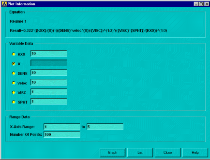 For either graphing or listing, select a variable to graph the result against, and set an x-axis range and the number of points to graph.