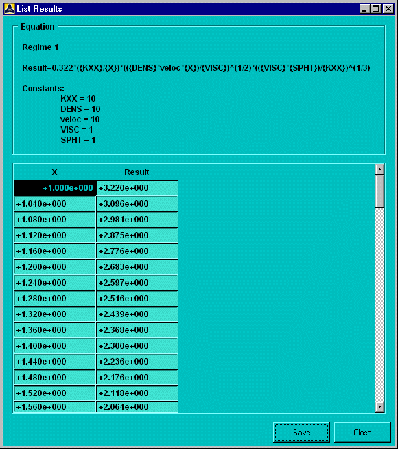 To generate a table displaying the plot point values, select the List option from the Plot Information dialog box. The settings you chose in the Plot Information dialog box are used to generate the values. An example of such a table follows: