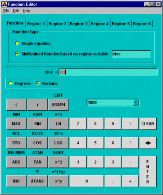 Select to bring up the function editor. The function boundary condition being applied is a multivalued function, its final value being dependent on the X location in the domain. In the Function Editor dialog box, click the radio button for "Multivalued function based on regime variable" and type xloc as the name of the regime variable in the text entry box. The name xloc appears as the name of the regime variable. To define xloc, select "X" from the drop-down box on the lower half of the dialog box. Your dialog box should look like this:
