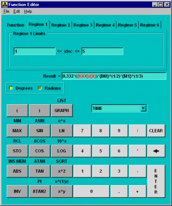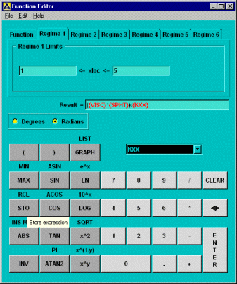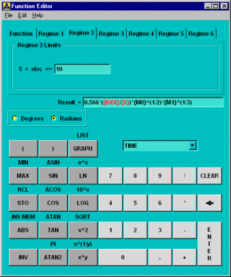 Select the tab. First, enter "10" as the upper limit for the regime variable for which this equation is valid. Notice that the lower limit for this regime is already set as the upper limit from Regime 1. This feature ensures continuity between the regimes. Type in the expression for the heat transfer coefficient as shown below. You can use the same stored memory locations M0 and M1 to replace expressions for Reynold's number and Prandtl number, respectively. Your dialog box should look like this: