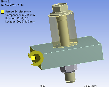 local,12,0,50.0026090261661,50.0000009547169,40.,-180.,0.,180. nsel,s,,,bolt_node esln psmesh,19,,,all,,12,z,0,,,torque allsel,allIn the first load step, you typically apply a force or a displacement to the joint element with the FJ or DJ command. In this case, the load is applied as a force and a moment in the z-direction. A negative FZ value is used to create the effect of pretension. The force "locks" on the second step, allowing additional loads. The effect of the initial load is preserved as a displacement after it is locked. The full model is rotated around the x-axis 30 degrees to the remote point.
