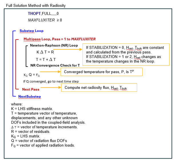 In Figure 3.5: FULL Solution Method When Radiosity Is Present and Figure 3.6: QUASI Solution Method When Radiosity Is Present (under Solving for Temperature and Radiosity in the Thermal Analysis Guide), refer to the KQQ = FQ equation system via the iterative method.