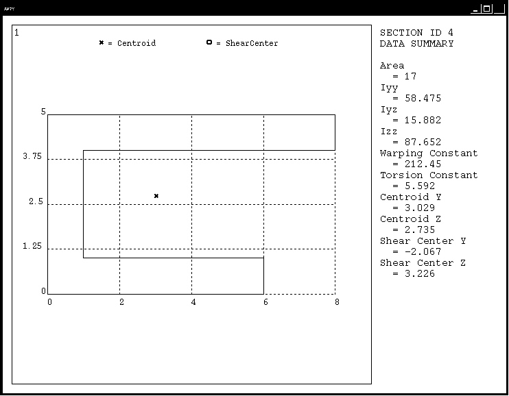 the centroid, shear center, and origin. SECPLOT also lists various section properties such as Iyy, Iyz, and Izz.