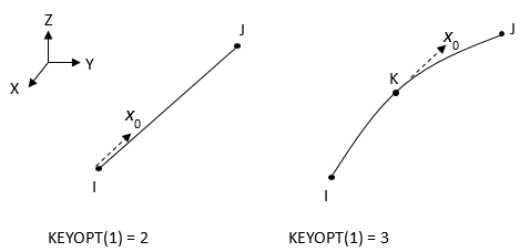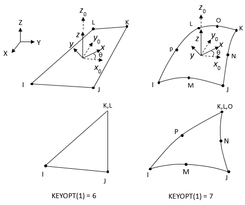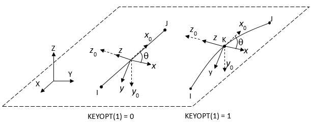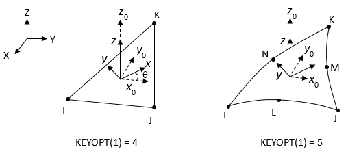 X,Y,Z: Global coordinate system x0, y0, z0: Default element coordinate system x, y, z: Element coordinates when element orientation ( KCNand/orTHETA) is specified.θ: Orientation angle defined by KCNand/orTHETA