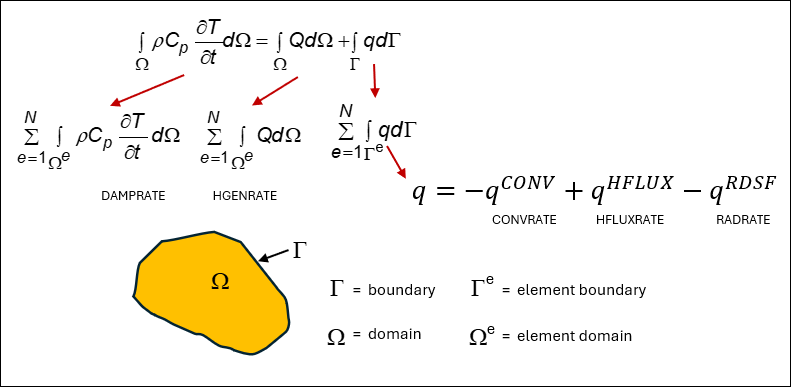 These element NMISC values, summed over all elements at each substep, correspond to terms in the general heat equation as described below where: