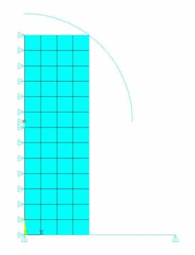 /batch,list /filname,RznExample1 /prep7 /com define parameters h=20 b=10 el=b/8 xc=17.5 yc=32.99038 rc=15 PilotMove= -13 c10=62.3584129 c01=-37.8485452 dd=1e-4 /com define element types, material, etc. et,1,182 keyopt,1,3,2 keyopt,1,6,1 et,2,169 et,3,172 keyopt,3,9,0 keyopt,3,10,0 et,4,169 et,5,172 keyopt,5,9,0 keyopt,5,10,0 tb,hyper,1,,2,mooney tbdata,1,c10,c01,dd mp,mu,2,0.0 r,3 r,4 /com define geometry k,1,xc,yc k,2,xc,yc,yc k,3,xc-rc,yc k,4,0.0,0.0 k,5,2*rc,0.0 rect,0,b,0,h circle,1,rc,2,3,360,1 /pnum,line,1 lplot l,4,5 lplot aplot /com create solid elements esize,el mat,1 type,1 real,1 amesh,1 /com generate the 1st contact pair mat,2 real,3 type,2 esize,h lmesh,5,7 *get,PilotID,node,,num,max PilotID=PilotID+1 nkpt,PilotID,1 tshap, pilo e,PilotID type,3 lsel,,,,2,3 nsll,,1 esln,,0 esurf alls /com generate the 2nd contact pair real,4 type,4 lmesh,8 lsel,,,,8 esll esurf,,reverse alls type,5 lsel,,,,1,2 nsll,,1 esln,,0 esurf alls /com apply boundary conditions and loads d,PilotID,ux,0.0 d,PilotID,uy,PilotMove d,PilotID,rotz,0.0 lsel,,,,4 nsll,,1 d,all,ux,0.0 alls lsel,,,,8 nsll,,1 d,all,uy,0.0 alls nlist elist dlist /com check the contact definition cncheck finish /solution rescontrol,,all,1 pred,off nlgeom,on time,1 NSUBST,10,100,5 outres,all,all solve finish /post1 set,1,6 prns,u,comp prns,s,comp prns, cont finish
