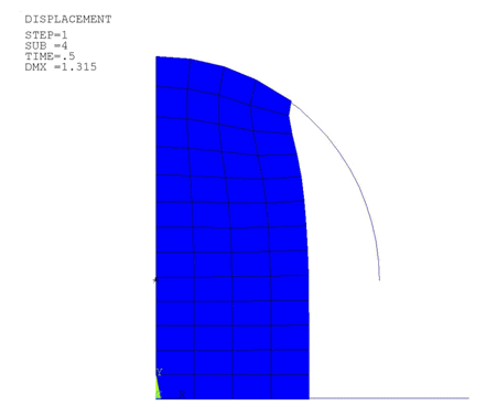 With the deformed mesh corresponding to load step 1, substep 4 is shown next. Ansys ICEM CFD uses the boundary segments of this mesh next to generate the new mesh. The nodal discretization at the boundary remains same for both the old and the new mesh.