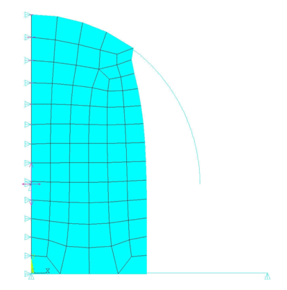 The solid element used in the model is PLANE182 (using the B-Bar method with mixed u-P formulation). CONTA172 and TARGE169 elements are also used. The material model used is a hyperelastic material with a three-parameter OGDEN option.