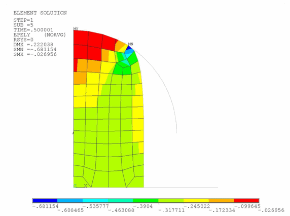 Next, the total elastic strain along the Y axis for this mesh is shown. This is one of the state variables which is transferred to the new mesh when mapping solved node and element solutions from the original mesh to the new mesh (MAPSOLVE).