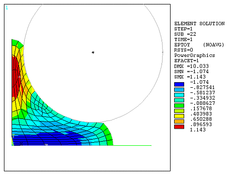 Most nonlinear material models, especially those employing hyperelastic materials, have their own applicable ranges. When a deformation is too large or a stress state exceeds the applicable range, the material may become unstable. The instability can manifest itself as a mesh distortion, but rezoning cannot help in such cases. While it is sometimes difficult to determine when material is unstable, you can check the strain values, stress states, and convergence patterns. A sudden convergence difficulty could mean that material is no longer stable. The program also issues a warning at the beginning of the solution indicating when hyperelastic material could be unstable, although such a warning is very preliminary and applies only to cases involving simple stress states.