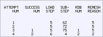 The REMESH REASON section in a NLAD-ETCHG .rmsh file has an additional option (5 - Element Type Change), indicating the mechanistic remeshing of a component with hex-dom elements (SOLID185 or SOLID186) to higher-order tetrahedral elements (SOLID187). In the example, one such component exists and NLAD-ETCHG has successfully remeshed the hex-dom elements in the component to tetrahedral elements in (load step = 5, substep = 75). The resulting tetrahedral mesh has been successfully remeshed again via standard nonlinear mesh adaptivity (load step = 6, substep = 4) by the same remeshing criteria.