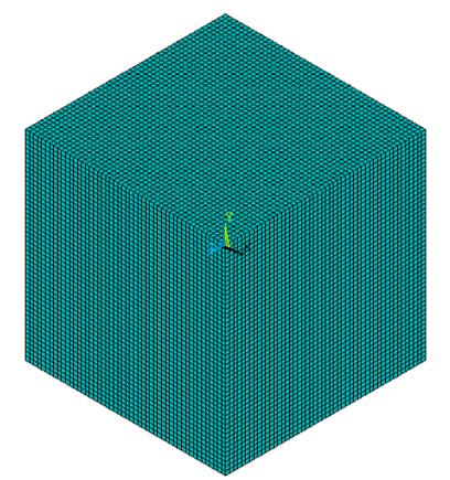 Because the microstructures are voxelated, each voxel in the geometry is converted directly into a SOLID185 element, leading to the structured mesh with 125000 (50 x 50 x 50) elements used for the simulations described in Hall-Petch Effect from Various Grain Sizes: