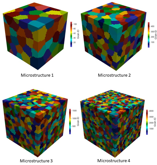 To simulate the grain size effects, four synthetic microstructure representative volumes with decreasing average grain sizes are generated.