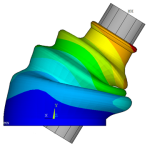 | A simulation of a rotor fan blade with disk using a nonlinear static analysis with inverse solving to obtain the cold geometry from the hot geometry in a single solution. |