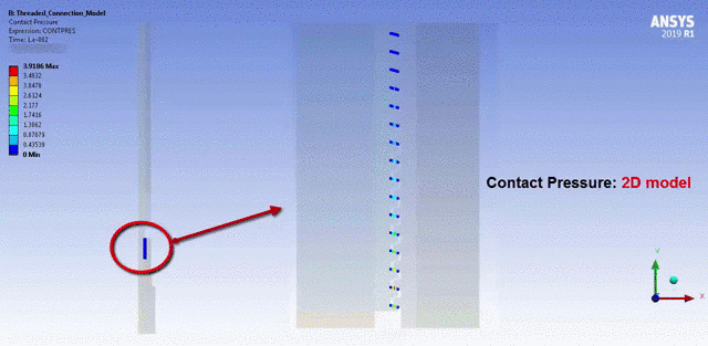 This animation shows the change in contact pressure for the threaded connection during the entire analysis: