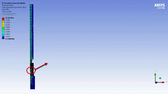 This animation shows the equivalent stress result during the full analysis, and the change in the threaded-connection status at the last load step (during bending):