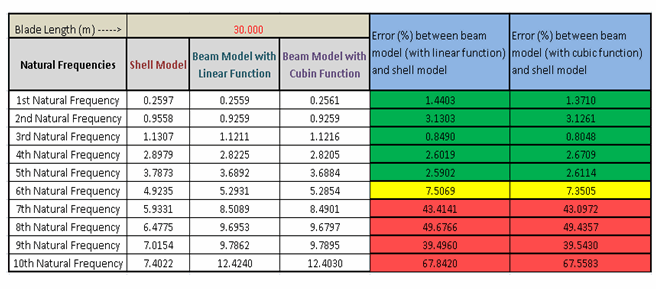 The following table summarizes the natural frequency results from the analyses of the three blade models: