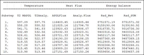 The calculated temperature, heat flux, and energy balance of the moving outer cylinder are listed for each substep. Results from an analytical solution derived following the method outlined by Lebedev, et al. [1] are also listed. The similarities of these results verify the accuracy of the procedure to enable view factor updating at the substep level (VFUP).