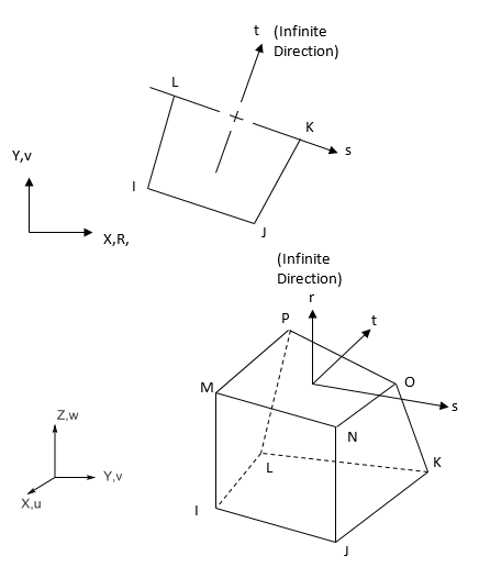 The 1D element may be thought of as one edge of the 2D solid infinite element, as shown: