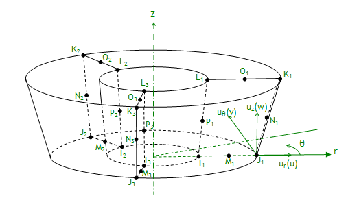 Although the elements are initially axisymmetric, the loads and deformation can be general in nonaxisymmetric 3D. The displacements are interpolated in elemental coordinate system by interpolation functions, but the user can define the nodal displacements in any direction.