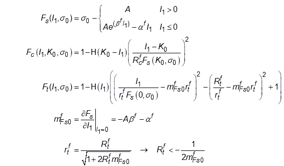 The yield surface for tension and compression "regimes" are described by Equation 4–88 and Equation 4–89 (Chen and Han([332])).