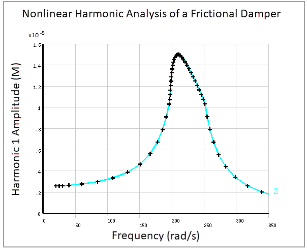 The model is solved using the harmonic balance method with one harmonic (HROPT,HBM,1) on a frequency range from 20 to 350 rad/s. Appropriate displacement and frequency scaling factors of 10-5 and 200 respectively are applied to improve the convergence rate.