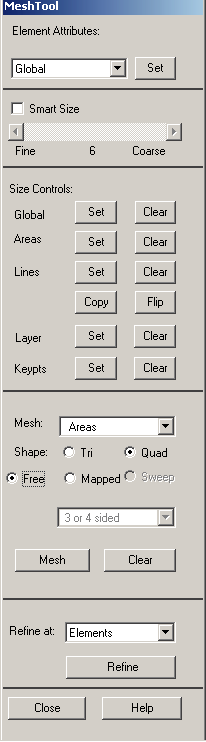 Globaloption button causes an option menu of available choices (Global,Volumes,Areas,Lines,KeyPoints) to appear. After selecting an option, press the button to specify attributes.- SmartSizing Controls