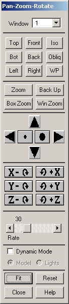 Determines the amount of pan, zoom, or rotate that is initiated with the arrow, dot and rotate buttons above. The rate can vary from 1 to 100. A rate of 1 means that each time you pick one of the buttons, the model will pan, zoom or rotate a relatively small amount. For instance, a rate of 1 corresponds to a 1 degree rotation about a screen axis each time you pick one of the rotation buttons.
