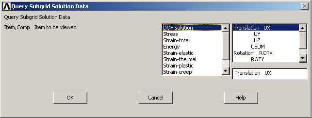 For any picked subgrid point on the model, Mechanical APDL retrieves the data value from the database and displays it. The /EFACET command controls the number and location of subgrid points available for querying and the AVRES command controls the method of averaging results for querying.
