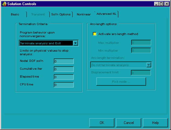 [ARCLEN, ARCTRM]--Controls activation and termination of the arc-length method. Click the Activate arc-length method check box to activate it, and then use the Max multiplier and Min multiplier entry boxes to specify the maximum and minimum multipliers of the reference arc-length radius.
