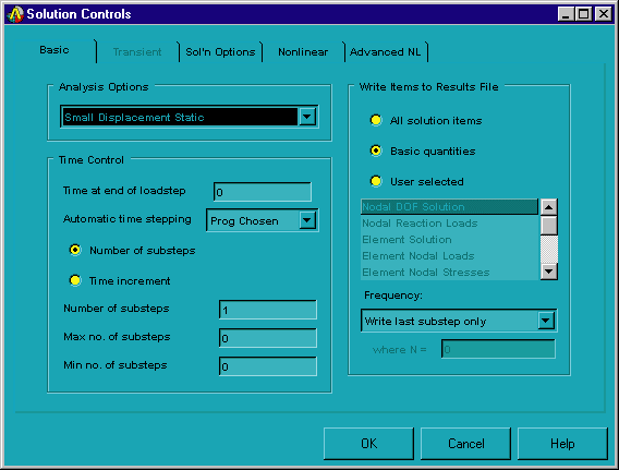Use the Frequency drop down list box to indicate how frequently you want Mechanical APDL to write the selected solution items to the database. You can choose one of these options: Write every substep, Do not write any substeps, Write last substep only, Write every Nth substep, or Write N number of substeps.