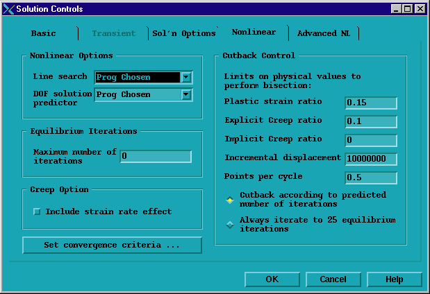 [CNVTOL]--Sets convergence values for the analysis. Click the button to access the Nonlinear Convergence Criteria dialog box. The dialog box contains a button that you can click for more information.