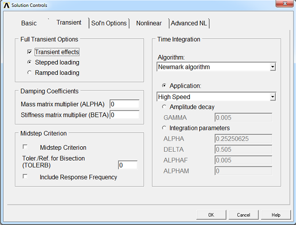 Amplitude decay: Defines an amplitude decay for the second order transient integration. If you choose this option, use the GAMMA entry box to specify the factor.