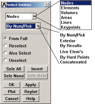 By Num/Pick: Select an entity by keyboard entry or by graphical picking.Exterior: Select entity type on exterior of currently selected item. You must select entities to be used before entering this dialog box.By Results: Select entities having solution results within a chosen range. You must save solution results in an element table [ETABLE] before you can choose these elements.Live Elem's: Select elements that have not been previously "killed" [EKILL], or that have been previously "born" [EALIVE] after being "killed." See the discussion on element birth and death in the Advanced Analysis Guide.By Hard Points: Select those entities which are hard points.Concatenated: Select concatenated entity.