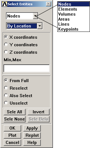 X,Y,Z Coordinates: Selects the Cartesian coordinate to use to specify location for area selection. Interpreted as R, Θ, Z for cylindrical coordinate system or R, Θ, Φ for spherical coordinate system. One coordinate at a time is specified. You must specify the coordinate system before entering this dialog box.