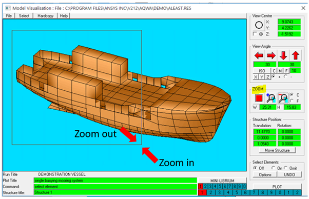 The ZOOM control panel allows you to zoom in and out on your model. The first button on the panel zooms to the extents of the model, and positions the model in the default position. (Zoom extents only accounts for model elements and not mooring lines). The zoom in (+) and the zoom out (-) buttons allow you to zoom in and out of your model by 100% or 5% depending on which of the two toggle buttons, Coarse & Fine, is selected.
