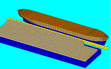 The lid is modeled by horizontal diffracting elements that must be contained in a single specified group. Their effect is controlled by two parameters: a "damping factor" and a characteristic length. The elements should be at the water surface between the vessels and have their normals pointing upwards. They do not need to follow the vessel outline closely so a simple mesh should be adequate, as illustrated in the figure below.